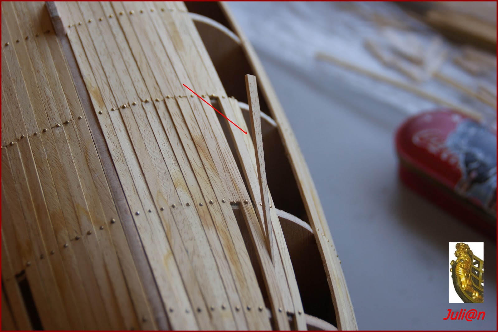 Continuamos con el revestimiento del casco, pegando y clavando un nuevo listón. Lo colocamos como indica la flecha roja de la fotografía, dejando que sobrepase ligeramente la proa.